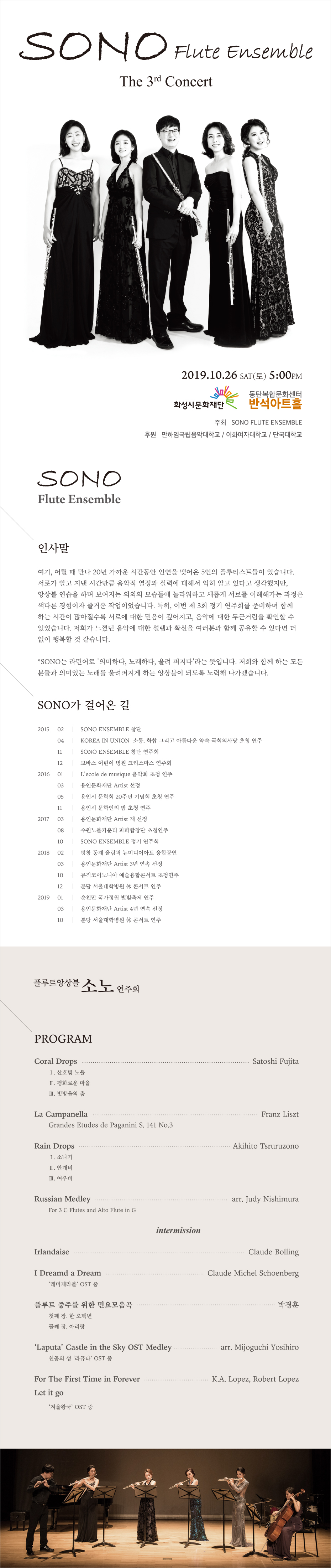 【[공 연]대관공연】Sono flute ensemble The 3rd concert 장소 동탄복합문화센터 반석아트홀 기간 2019년 10월 26일 ~ 2019년 10월 26일 공연시간 17:00 티켓정보 전석 초대 관람등급 전체관람가 문의 소노플루트앙상블 010.9093.4437 / 010.2245.5924 - 리스트이미지_180x120.jpg [ Size : 35.87KB, Down : 153 ] 미리보기 다운로드 정보용이미지_230x270.jpg [ Size : 64.33KB, Down : 156 ] 미리보기 다운로드 상세이미지.jpg [ Size : 1.18MB, Down : 618 ] 미리보기 다운로드 목록보기