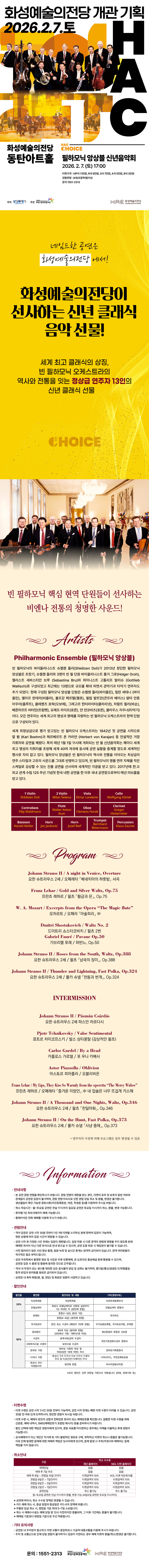 【[공 연]기획공연】 화성예술의전당 개관 기획 <필하모닉 앙상블 신년음악회> 장소 기타 기간 2026년 2월 7일 ~ 2026년 2월 7일 요일 금 공연시간 17:00(90분) 티켓정보 VIP석 11만원, R석 9만원, S석 7만원, A석 5만원, B석 3만원 관람등급 8세(초등학생)이상 문의 화성예술의전당 1551-2313 (공연랭킹) 필하모닉 앙상블 신년음악회.jpg [ Size : 5.76MB, Down : 7 ] 미리보기 다운로드 251202 화성시문화재단 예술의전당_필하모닉_포스터_A2.jpg [ Size : 2.62MB, Down : 7 ] 미리보기 다운로드 목록보기