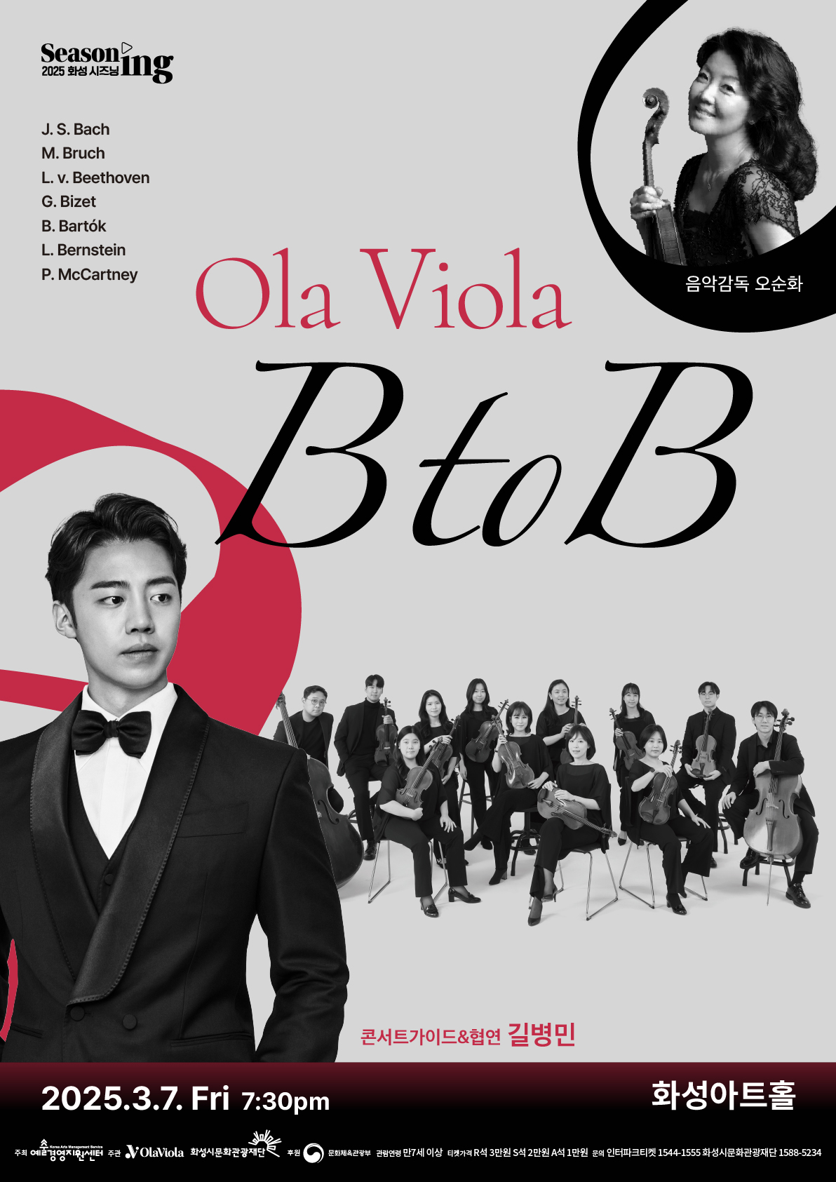 【[공 연]기획공연】올라비올라의 B to B 장소 화성아트홀 기간 2025년 3월 7일 ~ 2025년 3월 7일 요일 금 공연시간 19:30(90분) 티켓정보 R석 3만원, S석 2만원, A석 1만원 관람등급 만 7세 이상 관람가 문의 1588-5234 ※예매 바로가기 버튼은 2월 4일(화) 10시에 활성화됩니다. (03.07)올라비올라_아트홀목록.jpg [ Size : 87.29KB, Down : 318 ] 미리보기 다운로드 (03.07)올라비올라_아트홀목록 (25.03.07)올라비올라.jpg [ Size : 617.29KB, Down : 359 ] 미리보기 다운로드 (25.03.07)올라비올라 상세페이지_올라비올라.jpg [ Size : 950.03KB, Down : 1,183 ] 미리보기 다운로드 상세페이지_올라비올라 목록보기