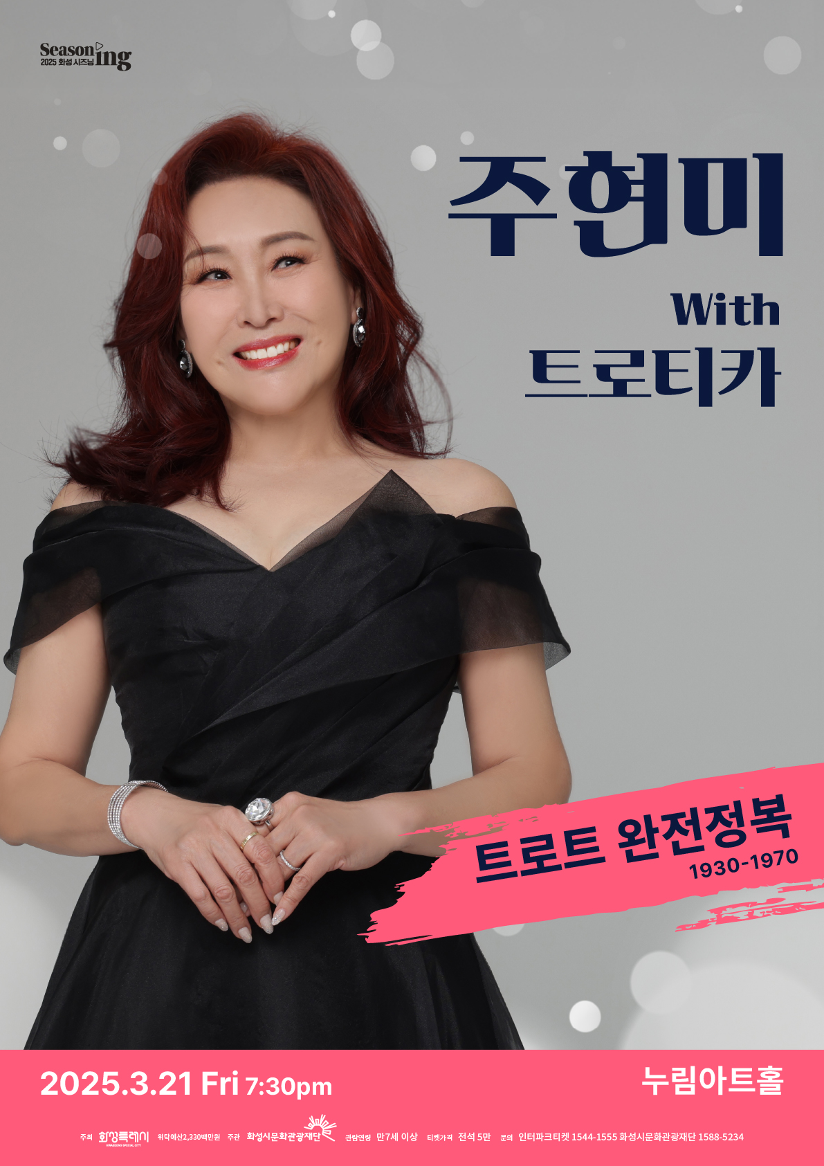 【[공 연]기획공연】주현미 with 트로티카 <트로트 완전정복1> 장소 누림아트홀 기간 2025년 3월 21일 ~ 2025년 3월 21일 요일 금 공연시간 19:30(80분) 티켓정보 전석 5만원 관람등급 만 7세 이상 관람가 문의 1588-5234 ※예매 바로가기 버튼은 2월 4일(화) 11시에 활성화됩니다. (03.21)주현미1_아트홀목록.jpg [ Size : 93.7KB, Down : 421 ] 미리보기 다운로드 (03.21)주현미1_아트홀목록 (25.03.21) 주현미 with 트로티카.jpg [ Size : 895.82KB, Down : 413 ] 미리보기 다운로드 (25.03.21) 주현미 with 트로티카 상세페이지_주현미-3월.jpg [ Size : 1.02MB, Down : 3,301 ] 미리보기 다운로드 상세페이지_주현미-3월 목록보기