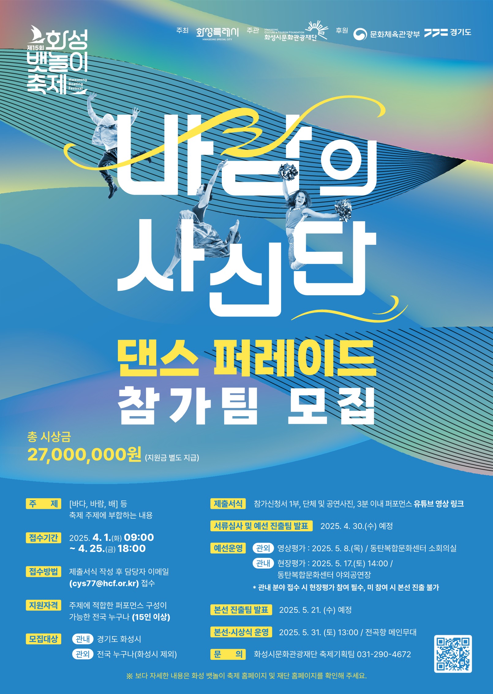 【[공 연]대관공연】제15회 뱃놀이 축제 바람의 사신단 댄스 퍼레이드 예선전 장소 동탄복합문화센터 야외공연장 기간 2025년 5월 17일 ~ 2025년 5월 17일 요일 토 공연시간 2025년 5월 17일(토) 14:00 (소요시간 180분) 티켓정보 전석무료 관람등급 전체관람가 문의 축제기획팀 031-290-4672 . 바람의 사신단 목록이미지.jpg [ Size : 813.28KB, Down : 168 ] 미리보기 다운로드 바람의 사신단 목록이미지 바람의 사신단 댄스 퍼레이드 참가팀 모집 포스터.jpg [ Size : 649.17KB, Down : 174 ] 미리보기 다운로드 바람의 사신단 댄스 퍼레이드 참가팀 모집 포스터 목록보기