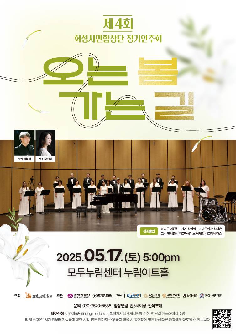 【[공 연]대관공연】제4회 화성시민합창단 정기연주회 장소 누림아트홀 기간 2025년 5월 17일 ~ 2025년 5월 17일 요일 토 공연시간 2025년 5월 17일 (토) 17:00 (소요시간 : 90분) 티켓정보 전석 초대 관람등급 5세 이상 문의 070-7570-5538 티켓 신청 : https://lineag.modoo.at/?link=5wk00l4l 1000017214-누림.png [ Size : 100.04KB, Down : 150 ] 미리보기 다운로드 1000017214-누림 포스터.png [ Size : 622.31KB, Down : 153 ] 미리보기 다운로드 포스터 1000017215-누림.png [ Size : 5.05MB, Down : 476 ] 미리보기 다운로드 1000017215-누림 목록보기