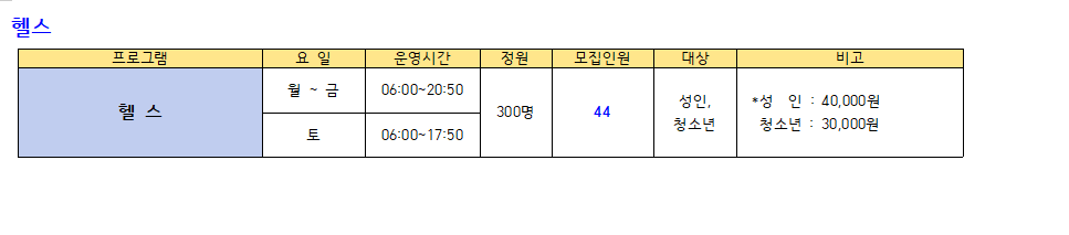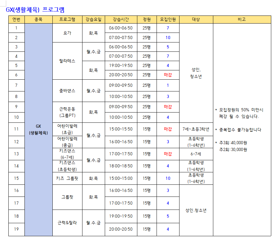 ● 모집프로그램: 수영(미취학.초등저학년.초등고학년, 월정기 자유수영), GX(생활체육), 헬스
