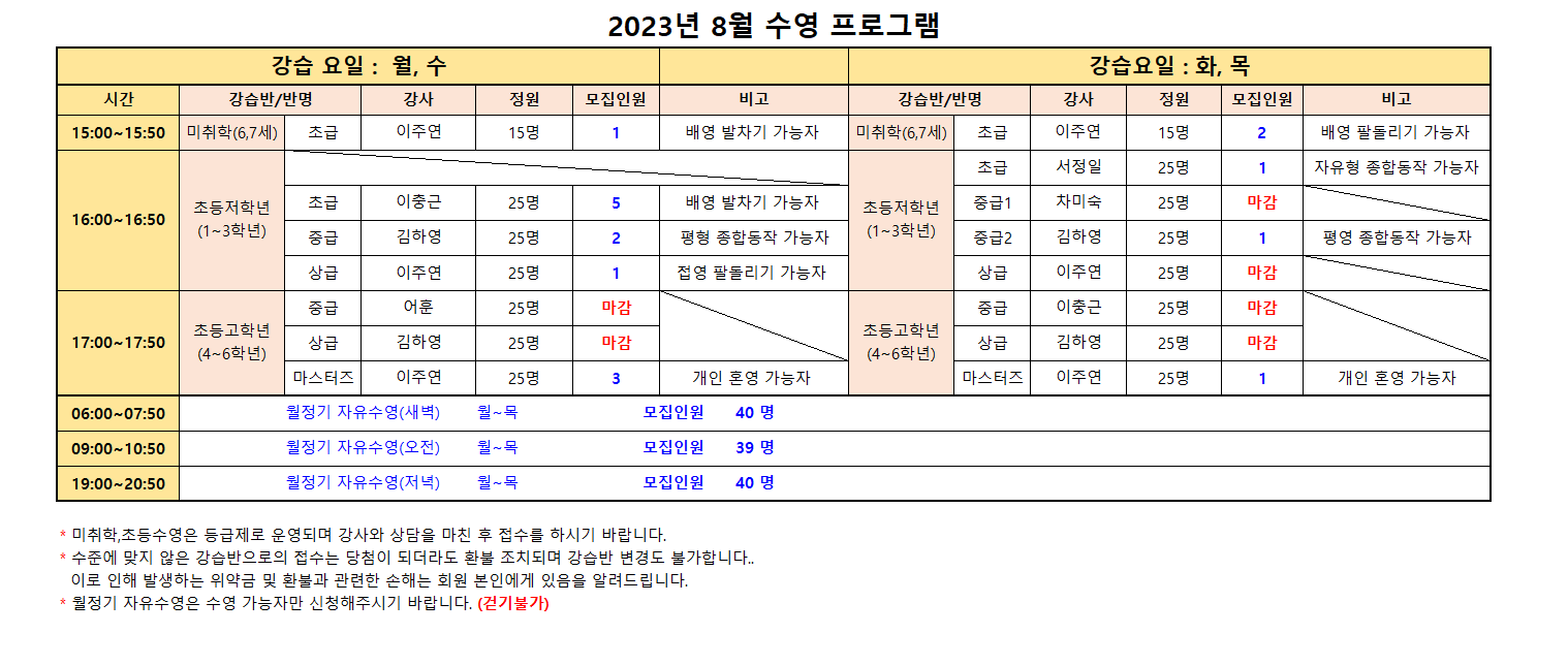 수준에 맞지 않은 강습반으로의 신규접수는 당첨이 되더라도 환불 조치되며 강습반 변경도 불가합니다..
