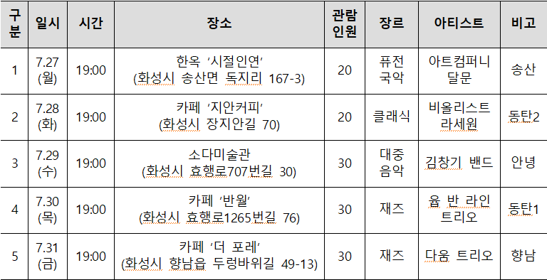 7. 우천시에는 공연이 연기(혹은 취소)되며, 공연일 하루 전 공지합니다.