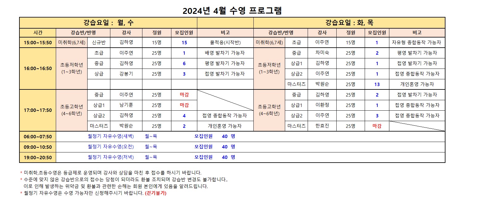 수준에 맞지 않은 강습반으로의 신규접수는 당첨이 되더라도 환불 조치되며 강습반 변경도 불가합니다..