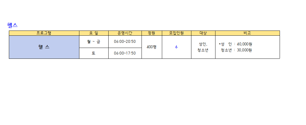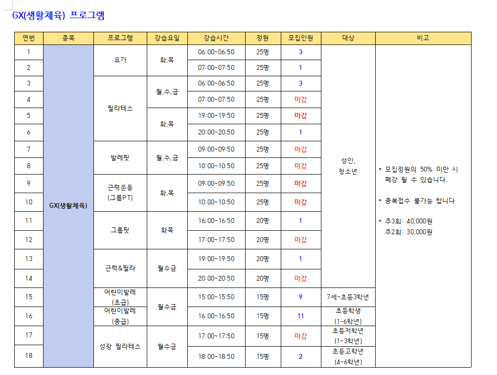 ※수영(성인,청소년) : 새벽수영(진도.마스터즈), 오전수영(진도.마스터즈), 저녁수영(진도.마스터즈), 아쿠아로빅, 청춘반은