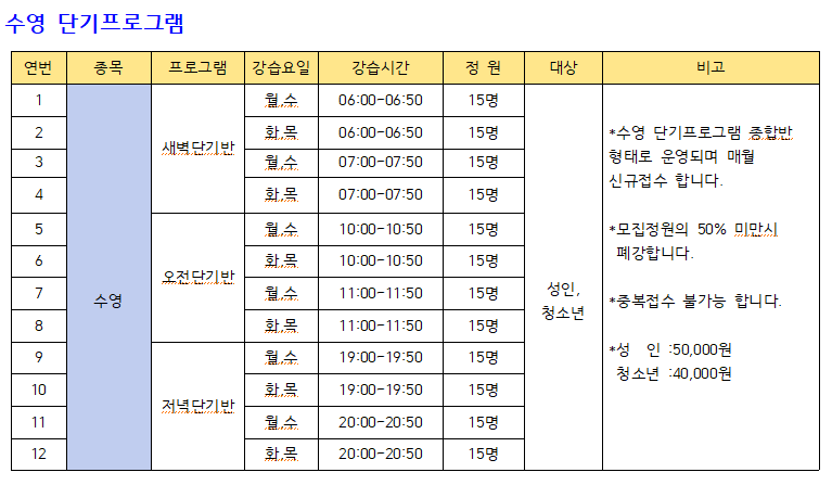 ▶ 비고 : 1. 수영 단기반은 매월 신규접수합니다.