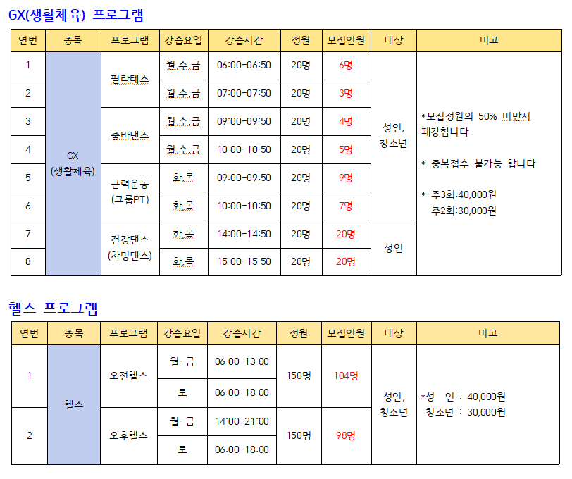 ▶ GX(생활체육): 필라테스(새벽), 줌바댄스, 근력운동(그룹PT), 건강댄스(차밍댄스) 운영