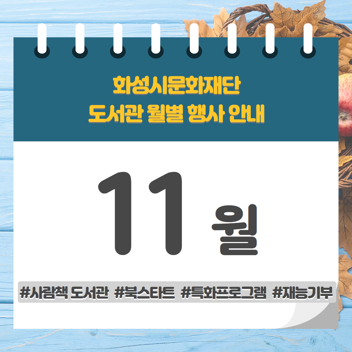 화성시문화재단 도서관 통합 월별 행사 안내 - 11월 작성자 관리자도서관 작성일 2023년 11월 8일 15시 16분 27초 조회 439 월별행사 24.png [ Size : 785.41KB, Down : 264 ] 미리보기 다운로드 월별행사 24 화성시문화재단 도서관 행사 안내화성시문화재단 도서관에서 진행하는 다양한 문화행사들을 통합해 안내드립니다! 자세한 사항은 도서관별 공지사항 및 화성시통합예약시스템을 확인해주세요! 도서관 사정에 따라 행사 일정 및 내용은 변동될 수 있습니다. 목록보기