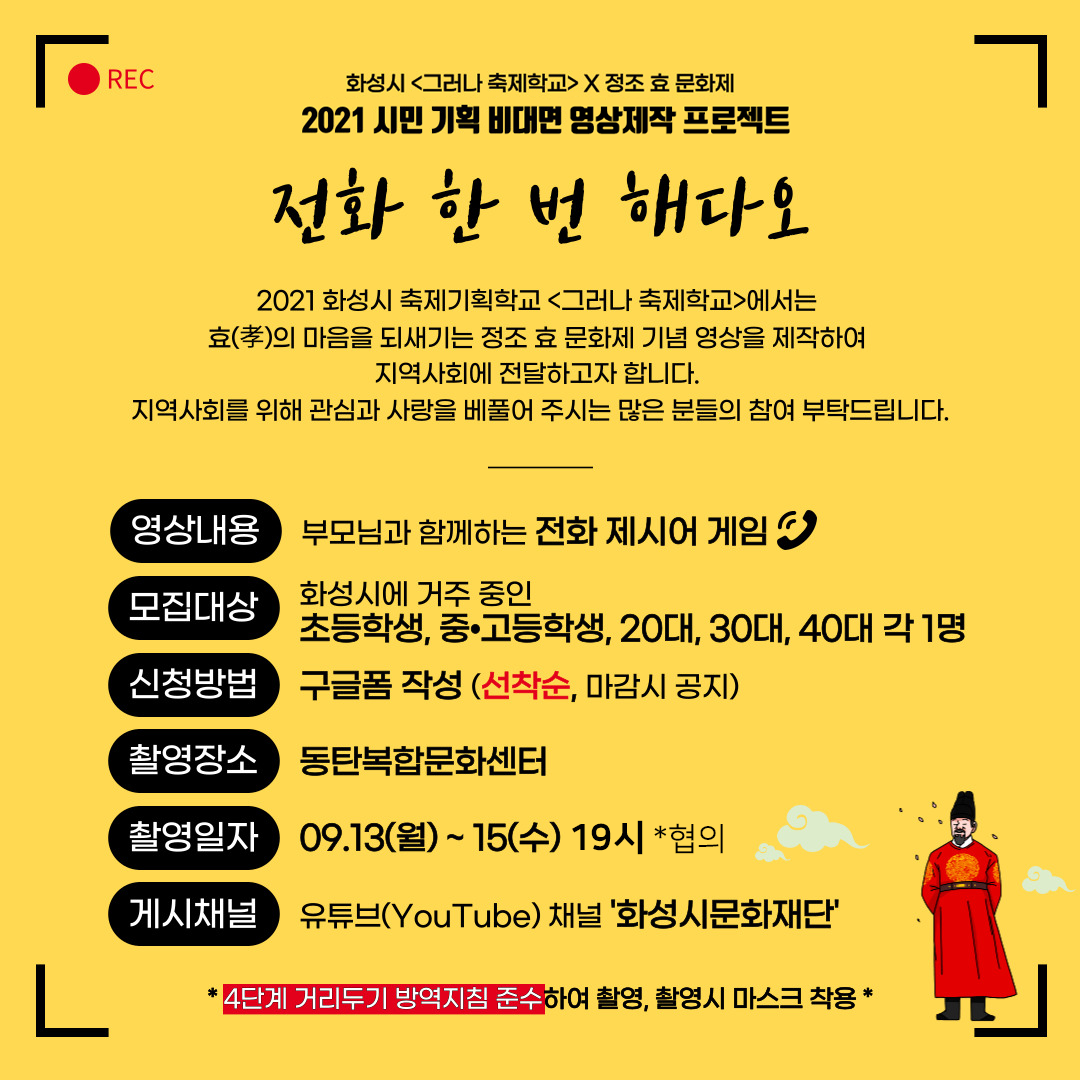현대에 알맞는 방식으로 '효'의 마음을 되새기고자 영상 제작 프로젝트를 진행하오니, 가족과 의미있고 특별한 추억을 만들고 싶은 화성시민분들의 많은 관심 부탁드립니다.