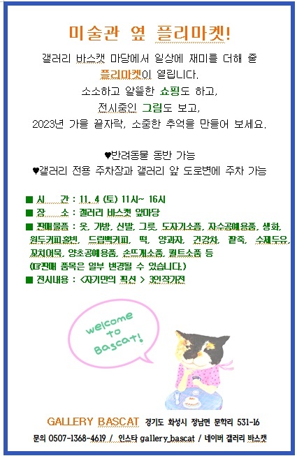 [대관료지원사업] 자기만의 픽션 <FICTION of ONE’S OWN> 작성자 관리자 작성일 2023년 10월 23일 17시 15분 27초 조회 509 KakaoTalk_20231020_141220388.jpg [ Size : 130.89KB, Down : 347 ] 미리보기 다운로드 KakaoTalk_20231020_141220388 변경주_전시회(플리마켓).jpg [ Size : 98.83KB, Down : 78 ] 미리보기 다운로드 변경주_전시회(플리마켓) <자기만의 픽션 - FICTION of ONE’S OWN> ○ 전시장소 : 갤러리 바스캣 (화성시 정남면 문학리 531-16 2층 1호)○ 전시기간 : 2023. 10. 28.(토) ~ 2023. 11. 12.(일)○ 무료전시* 화성시, 화성시문화재단 대관료 지원사업 지원을 받아 진행됩니다 * ○ 화성시민여러분의 많은 관람 부탁드립니다. 목록보기