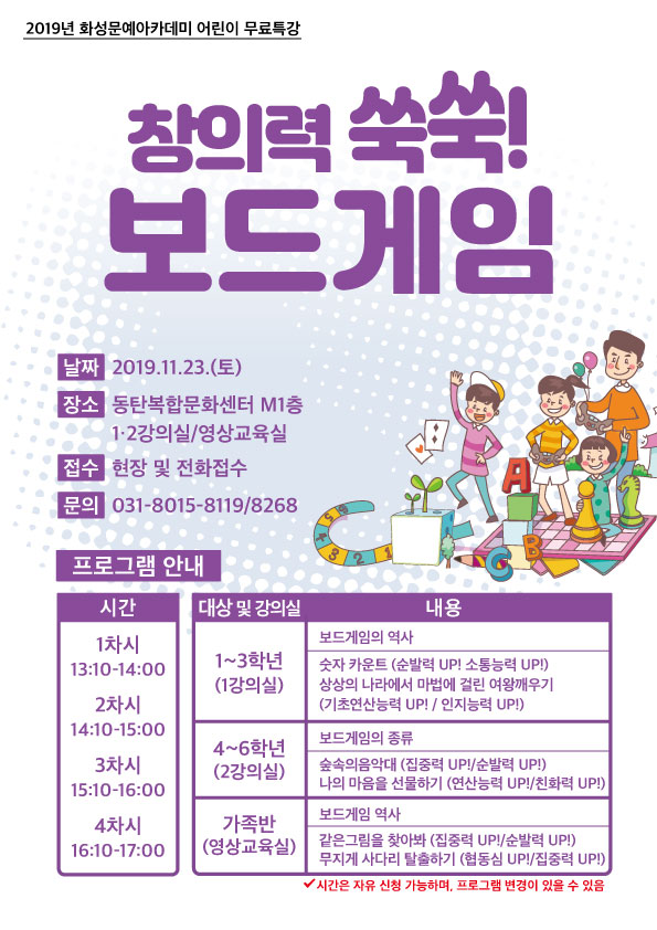 [화성문예아카데미] 화성문예아카데미 11월 특별강좌 안내 작성자 관리자 작성일 2019년 10월 30일 17시 6분 24초 조회 1,739 보드게임특강A4.jpg [ Size : 131.35KB, Down : 1,770 ] 미리보기 다운로드 목록보기