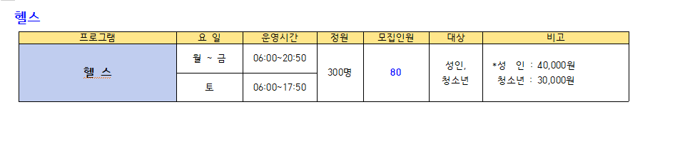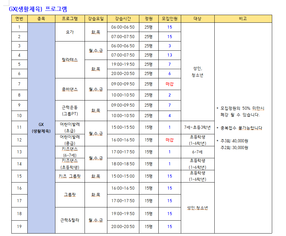 ● 모집프로그램: 수영(미취학, 초등저학년, 초등고학년, 월정기자유수영), GX(생활체육), 헬스
