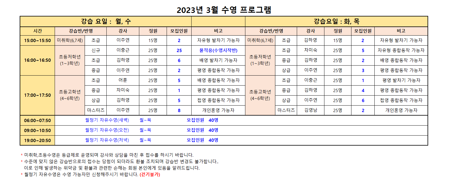 *수준에 맞지 않은 강습반으로의 신규접수는 당첨이 되더라도 환불 조치되며 강습반 변경도 불가합니다..
