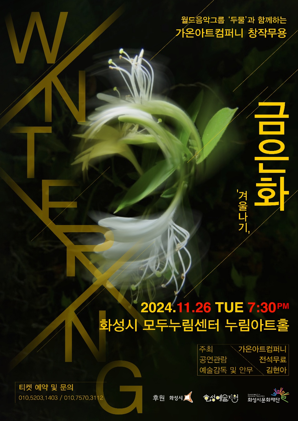 [2024 화성예술활동지원] 11/26(화) 19:30 가온아트컴퍼니-금은화'겨울나기' 작성자 관리자 작성일 2024년 10월 23일 14시 19분 15초 조회 853 홍보이미지(가온아트컴퍼니).jpg [ Size : 310.98KB, Down : 700 ] 미리보기 다운로드 홍보이미지(가온아트컴퍼니) 금은화_팜플렛.png [ Size : 3.07MB, Down : 144 ] 미리보기 다운로드 금은화_팜플렛 금은화_팜플레(1).png [ Size : 4.4MB, Down : 147 ] 미리보기 다운로드 금은화_팜플레(1) < 2024 화성예술활동지원> 선정작□ 공 연 : 창작무용극 <금은화-겨울나기>□ 일 시 : 2024. 11. 26.(화) 19:30□ 장 소 : 누림아트홀 □ 예 매 : 전석무료 ㅇ1ㅇ-5203-1403 / ㅇ1ㅇ-7570-3112□ 감독/안무 : 김현아 □ 주 최 : 가온아트컴퍼니□ 후 원 : 화성시, 화성시문화재단본 공연은 화성시, 화성시문화재단의 <2024 화성예술활동지원> 사업의 지원을 받아 제작되었습니다. 목록보기