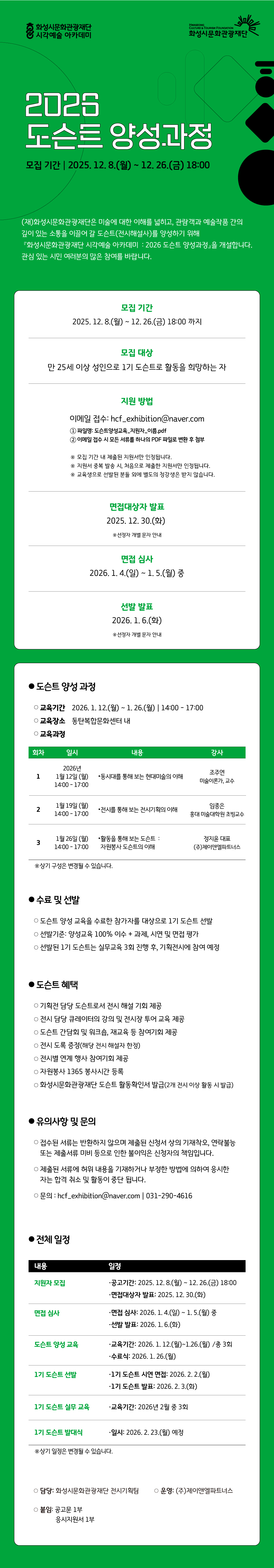 (재)화성시문화관광재단은 미술에 대한 이해를 넓히고, 관람객과 예술작품 간의 깊이 있는 소통을 이끌어 갈 도슨트(전시해설사)를 양성하기 위해 『화성시문화관광재단 시각예술 아카데미 : 2026 도슨트 양성과정』을 개설합니다. 관심있는 시민 여러분의 많은 참여를 바랍니다.