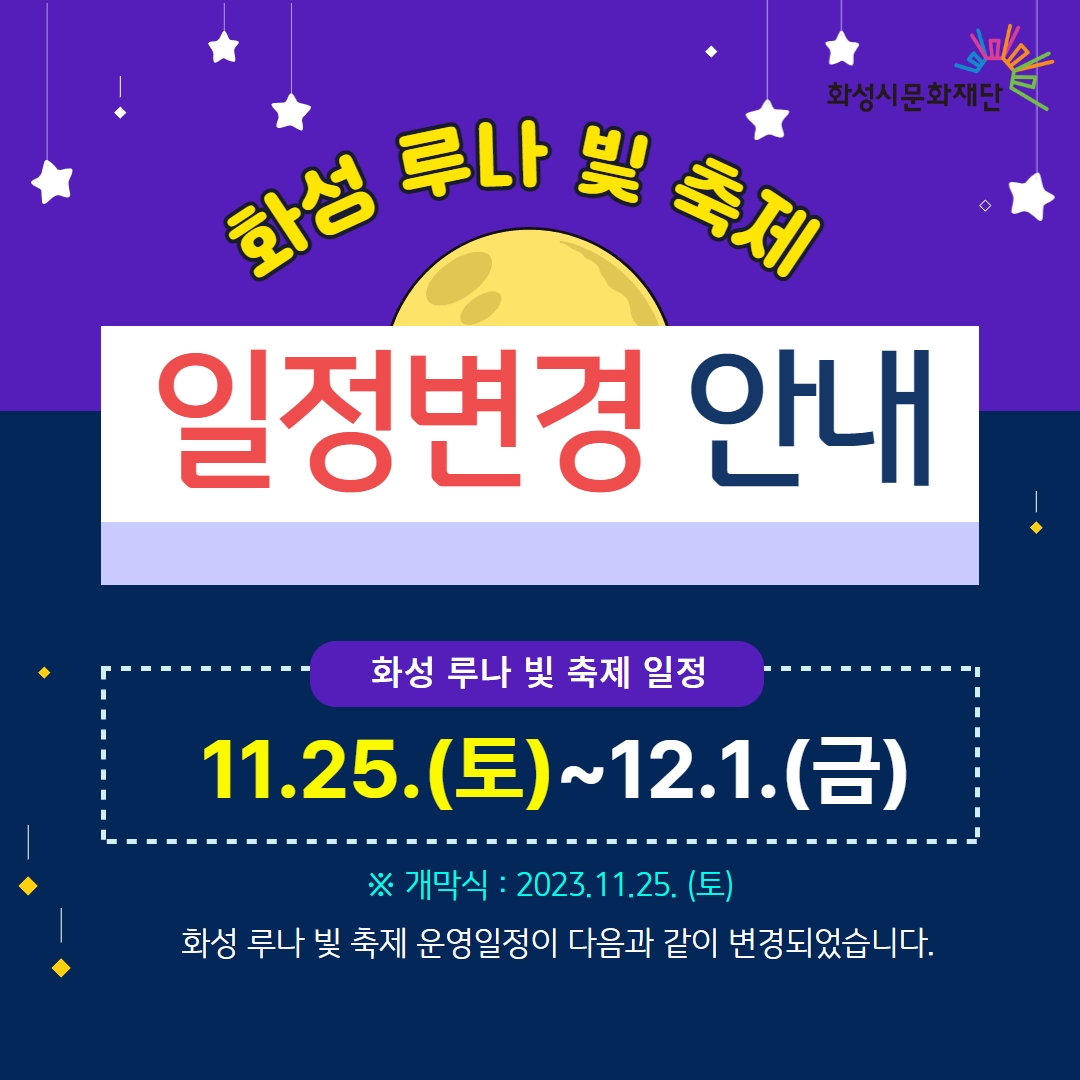 ※※ 일정 변경 안내 <2023 화성 루나 빛 축제> 11. 25.(토) ~ 12. 1.(금)