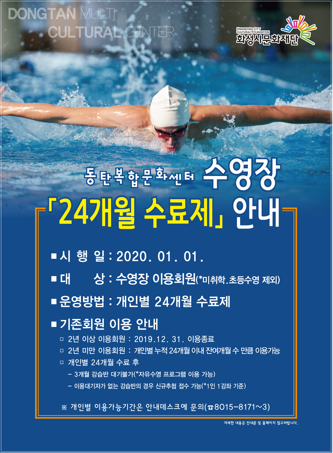 [스포츠] 동탄복합문화센터 수영장 '24개월 수료제' 안내 작성자 관리자 작성일 2019년 11월 7일 17시 31분 17초 조회 2,869 동탄복합문화센터 수료제안내.jpg [ Size : 1.26MB, Down : 4,077 ] 미리보기 다운로드 동탄복합문화센터 수영장 '24개월 수료제' 가 오는 2020년 1월 1일 부로 시행됨을 알려드립니다. 목록보기