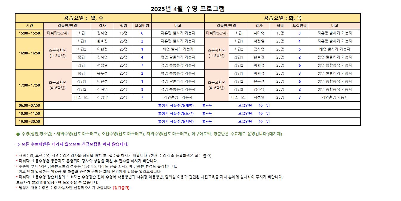 *미취학, 초등수영은 등급제로 운영되며 반드시 강사와 상담을 마친 후 접수를 하시기 바랍니다.
