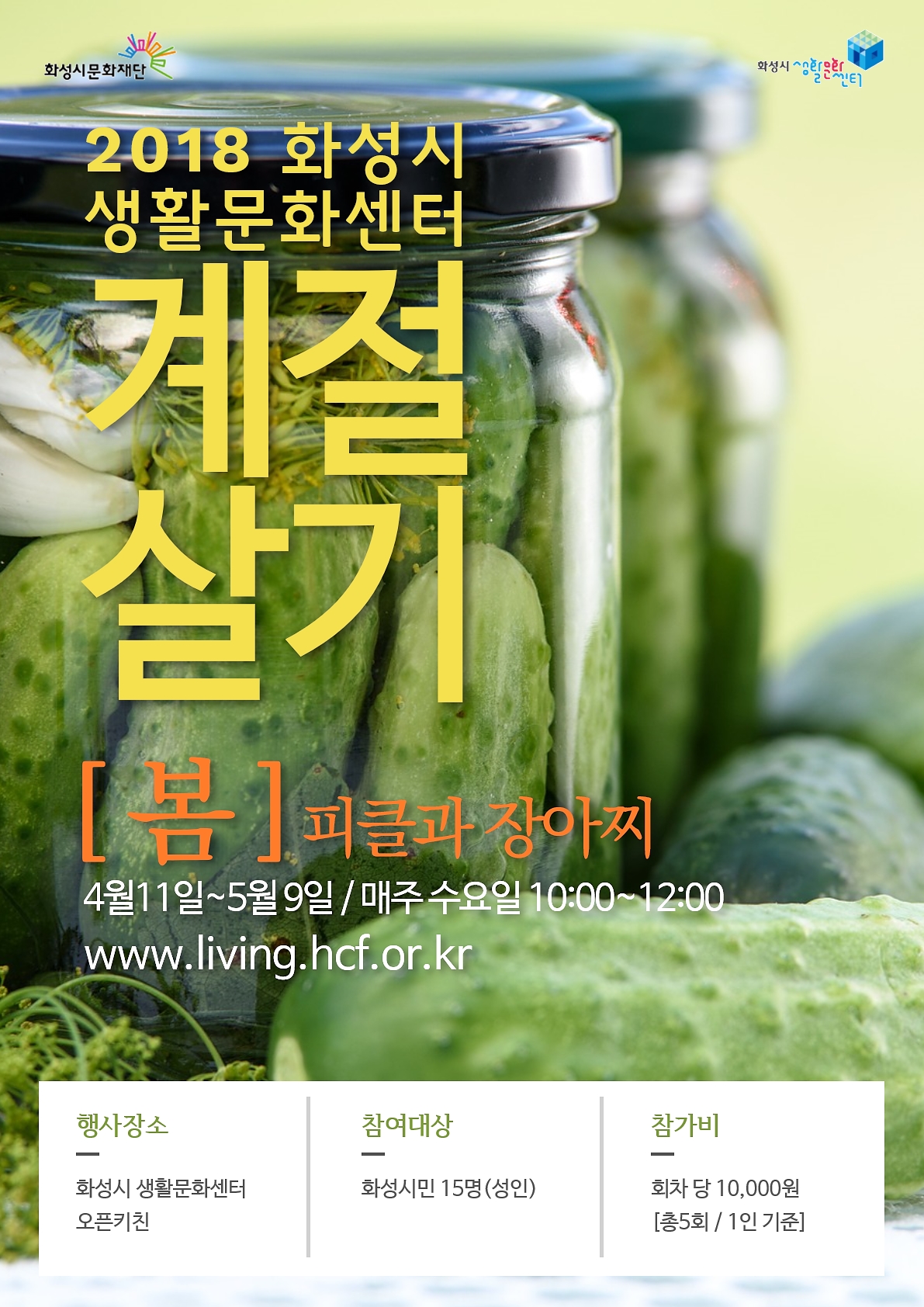 [화성시생활문화센터] 2018 계절살기 [봄: 피클과 장아찌] 작성자 관리자 작성일 2018년 4월 30일 18시 23분 15초 조회 906 계절살기.jpg [ Size : 956.58KB, Down : 490 ] 미리보기 다운로드 신청하기 ☞ click 목록보기