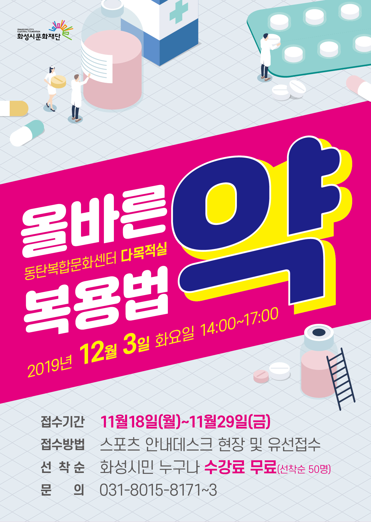 동탄복합문화센터 올바른 약 복용법 특강 <약> 작성자 관리자 작성일 2019년 11월 8일 17시 38분 9초 조회 955 1022동탄복합문화센터-약복용법(전단지)180AT,단면,A4-시안.jpg [ Size : 958.3KB, Down : 695 ] 미리보기 다운로드 동탄복합문화센터 올바른 약 복용법 특강 <약>2019년 12월 3일 (화) 14:00 - 17:00 동탄복합문화센터 다목적실화성시민 누구나 무료!!선착순 접수접수기간 : 11월18일~11월29일문의:031-8015-8171~3 목록보기