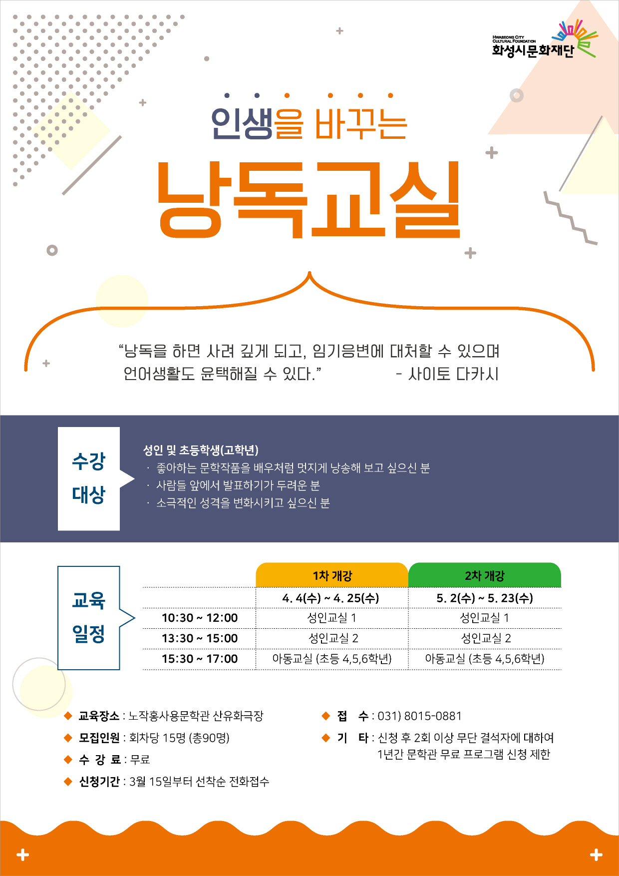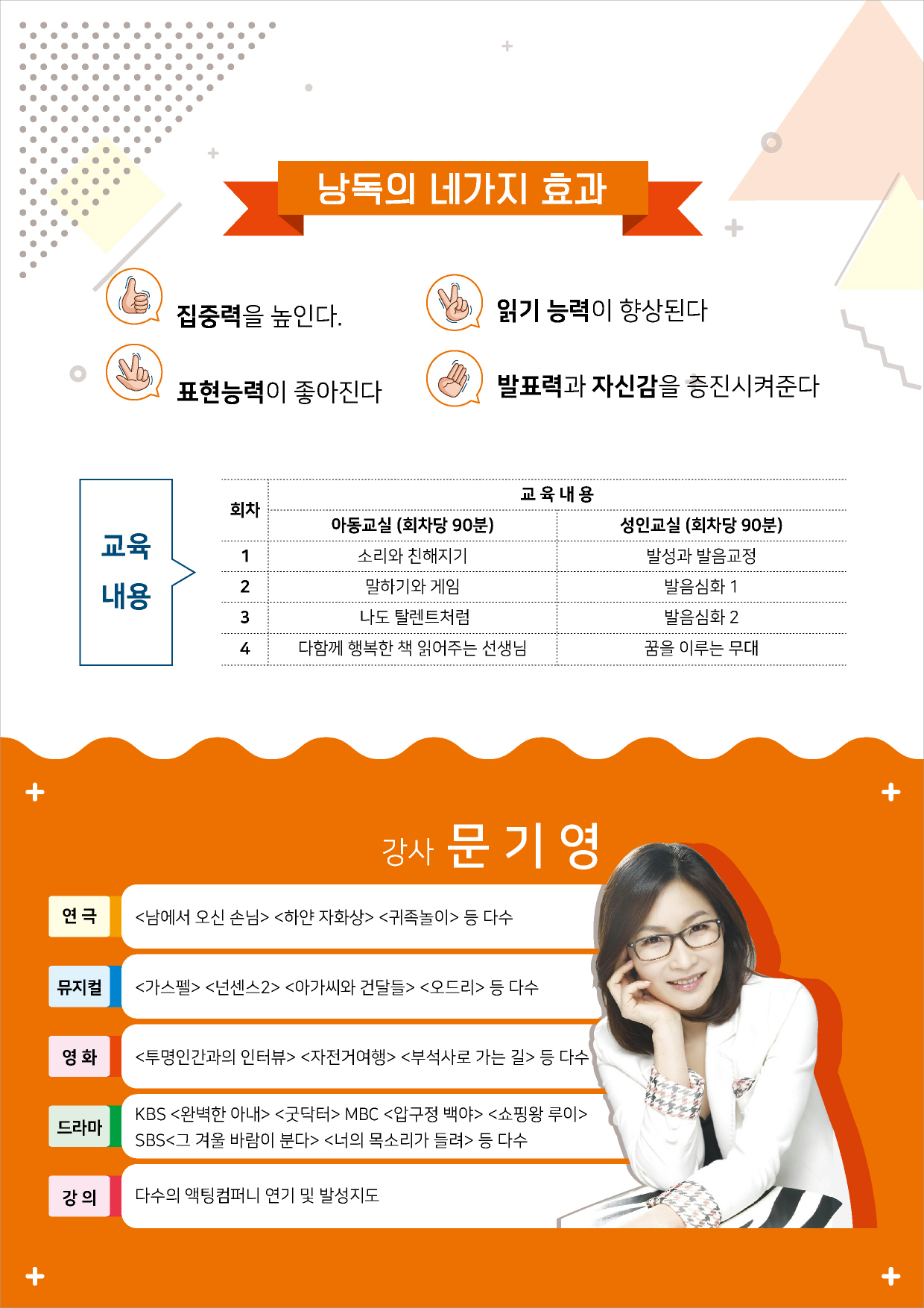 인생을 바꾸는 낭독교실 참가자 모집 작성자 관리자 작성일 2018년 4월 30일 18시 17분 40초 조회 940 크기변환_전단수정(앞).jpg [ Size : 633.98KB, Down : 438 ] 미리보기 다운로드 크기변환_전단수정(뒤).jpg [ Size : 700KB, Down : 418 ] 미리보기 다운로드 목록보기