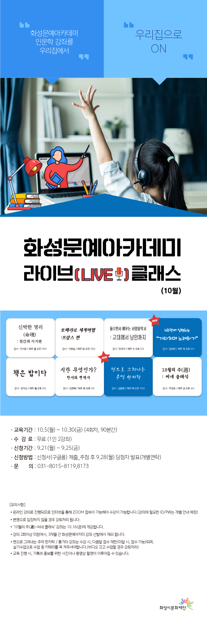 [화성문예아카데미] 우리집으로 ON! 10월 라이브클래스 안내 작성자 관리자 작성일 2020년 9월 21일 9시 39분 18초 조회 1,081 문예아카데미_라이브클래스_홈페이지공지사항 (2).jpg [ Size : 532.05KB, Down : 905 ] 미리보기 다운로드 10월 라이브클래스 접수하러가기 ☞ https://bit.ly/3hONn6L 목록보기
