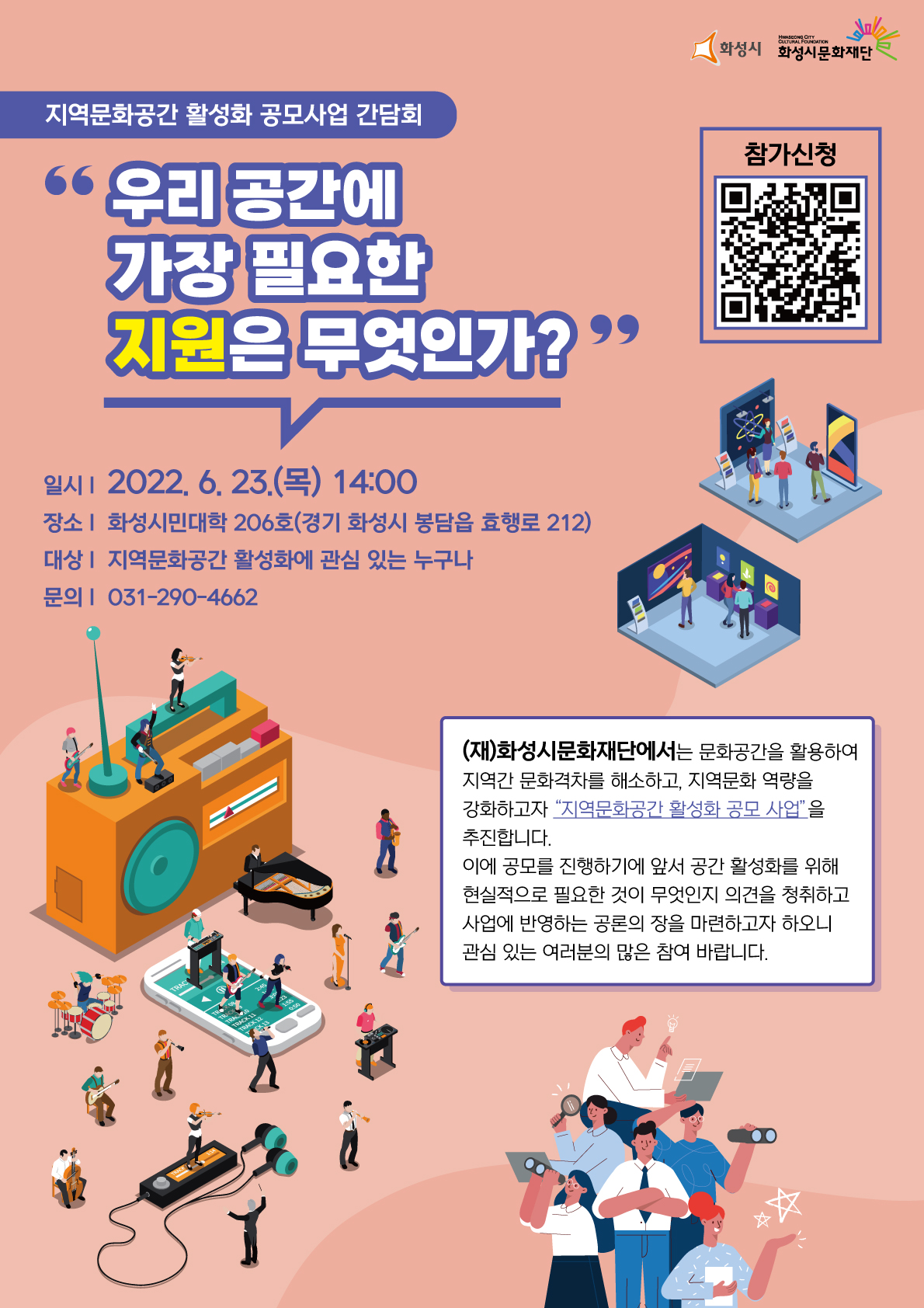 지역문화공간 활성화 공모사업 간담회 <우리 공간에 가장 필요한 지원은 무엇인가?> 작성자 관리자 작성일 2022년 6월 13일 14시 55분 55초 조회 477 포스터.jpg [ Size : 812.6KB, Down : 392 ] 미리보기 다운로드 포스터 ※참여신청(클릭) https://naver.me/GoBRHQJg 목록보기