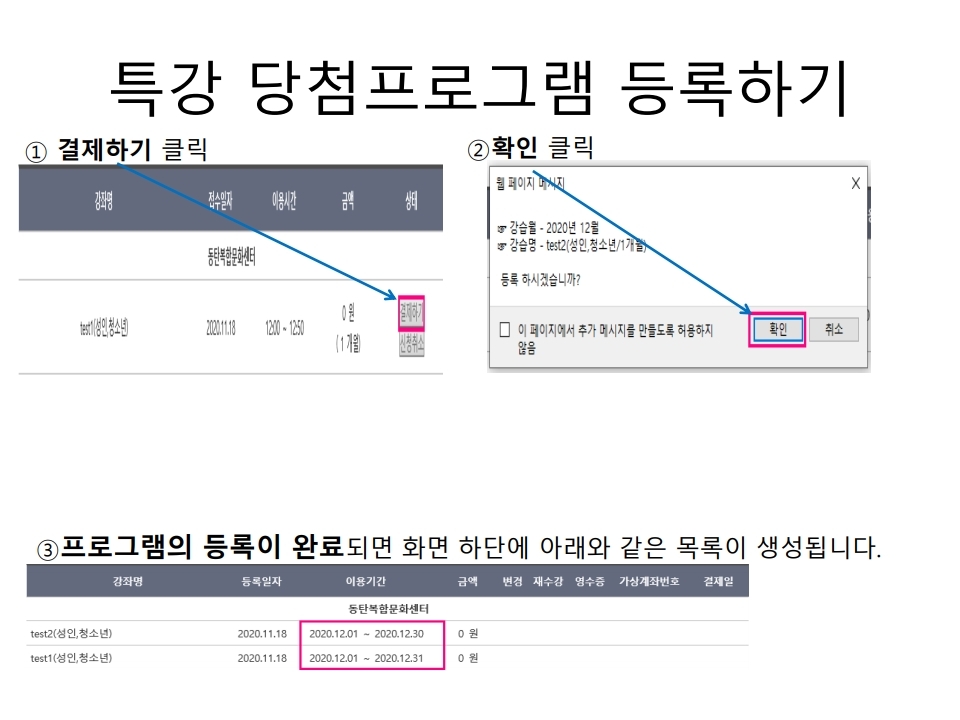 아래 추첨 결과를 확인하시고 안내된 방법에 따라 24시간(당첨자 문자발송)내에 등록을 완료하시어 프로그램 수강에 불편이 없으시길 바랍니다.