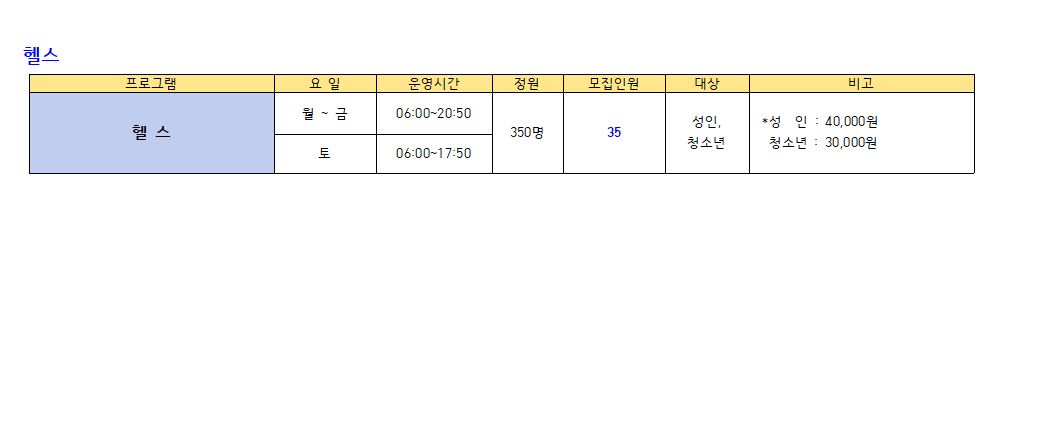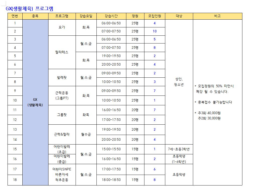 ● 모집프로그램: 수영(미취학. 초등저학년. 초등고학년, 월정기자유수영), GX(생활체육), 헬스