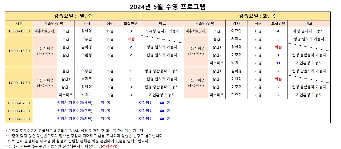 수준에 맞지 않은 강습반으로의 신규접수는 당첨이 되더라도 환불 조치되며 강습반 변경도 불가합니다..