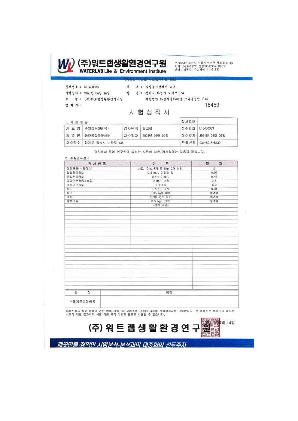 [스포츠] 2021년 4월 동탄복합문화센터 실내수영장 수질검사 성적서 작성자 관리자 작성일 2021년 5월 4일 11시 58분 28초 조회 669 2021년 4월 동탄복합문화센터 수영장 수질 성적서001.jpg [ Size : 125.46KB, Down : 79 ] 미리보기 다운로드 목록보기