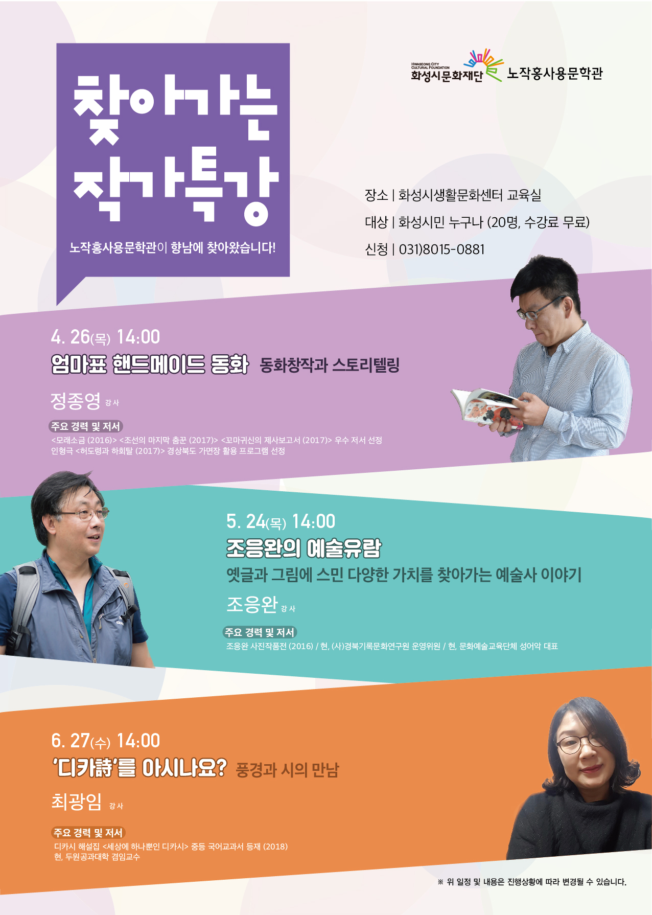 향남으로 찾아가는 작가특강 작성자 관리자 작성일 2018년 4월 30일 18시 43분 13초 조회 1,052 찾아가는작가특강_시안-01.jpg [ Size : 751.47KB, Down : 444 ] 미리보기 다운로드 목록보기