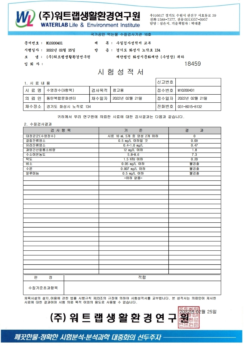 [스포츠] 2022년 2월 동탄복합문화센터 실내수영장 수질검사 성적서 작성자 관리자 작성일 2022년 3월 2일 11시 10분 58초 조회 606 동탄복합문화센터 2월 수질검사서.jpg [ Size : 401.5KB, Down : 409 ] 미리보기 다운로드 동탄복합문화센터 2월 수질검사서 목록보기