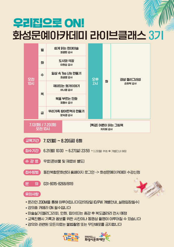 화성문예아카데미 라이브클래스 3기 수강생 모집 작성자 관리자 작성일 2021년 6월 21일 9시 49분 42초 조회 756 화성시문화재단교육운영팀-라이브클래스3기-웹홍보물-A4 (1).jpg [ Size : 224.57KB, Down : 648 ] 미리보기 다운로드 ★강의계획서 보러가기 https://bit.ly/3gBIaAU ★강의계획서 보러가기 https://bit.ly/3gBIaAU 목록보기