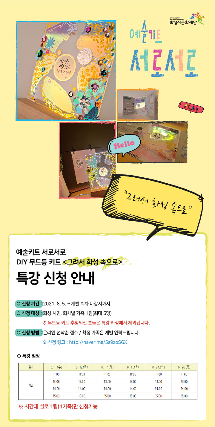 <예술키트 서로서로> 특강 신청 안내 작성자 관리자 작성일 2021년 8월 5일 14시 51분 42초 조회 640 서로서로-키트-특강-신청안내-상세페이지.jpg [ Size : 197.78KB, Down : 607 ] 미리보기 다운로드 서로서로-키트-특강-신청안내-상세페이지 신청 링크: http://naver.me/5s9zoSGX 목록보기
