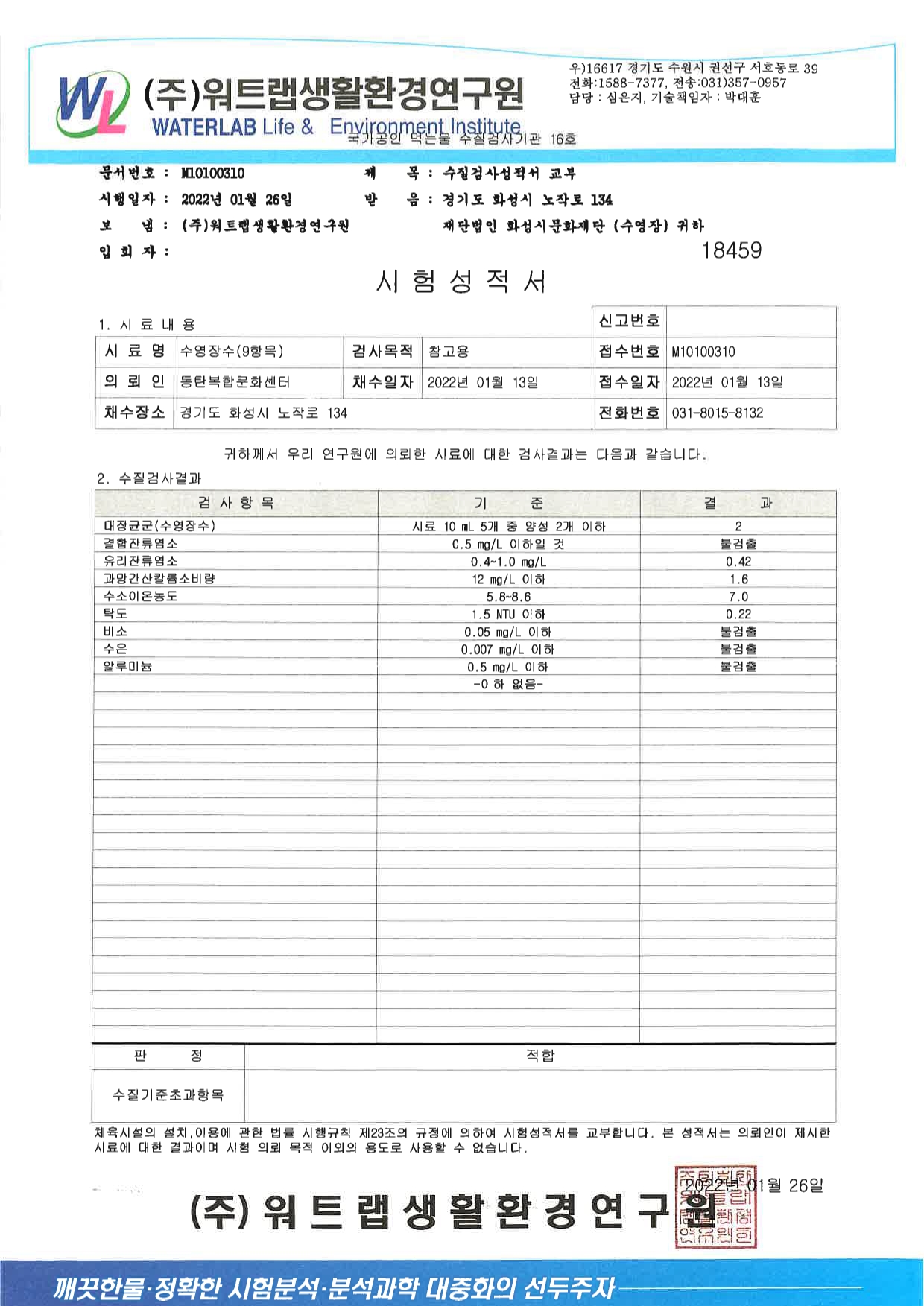 [스포츠] 2022년 1월 동탄복합문화센터 실내수영장 수질검사 성적서 작성자 관리자 작성일 2022년 2월 7일 13시 9분 20초 조회 635 2022년 1월 동탄복합문화센터 수영장 수(水) 검사 성적서.jpg [ Size : 605.56KB, Down : 438 ] 미리보기 다운로드 2022년 1월 동탄복합문화센터 수영장 수(水) 검사 성적서 목록보기