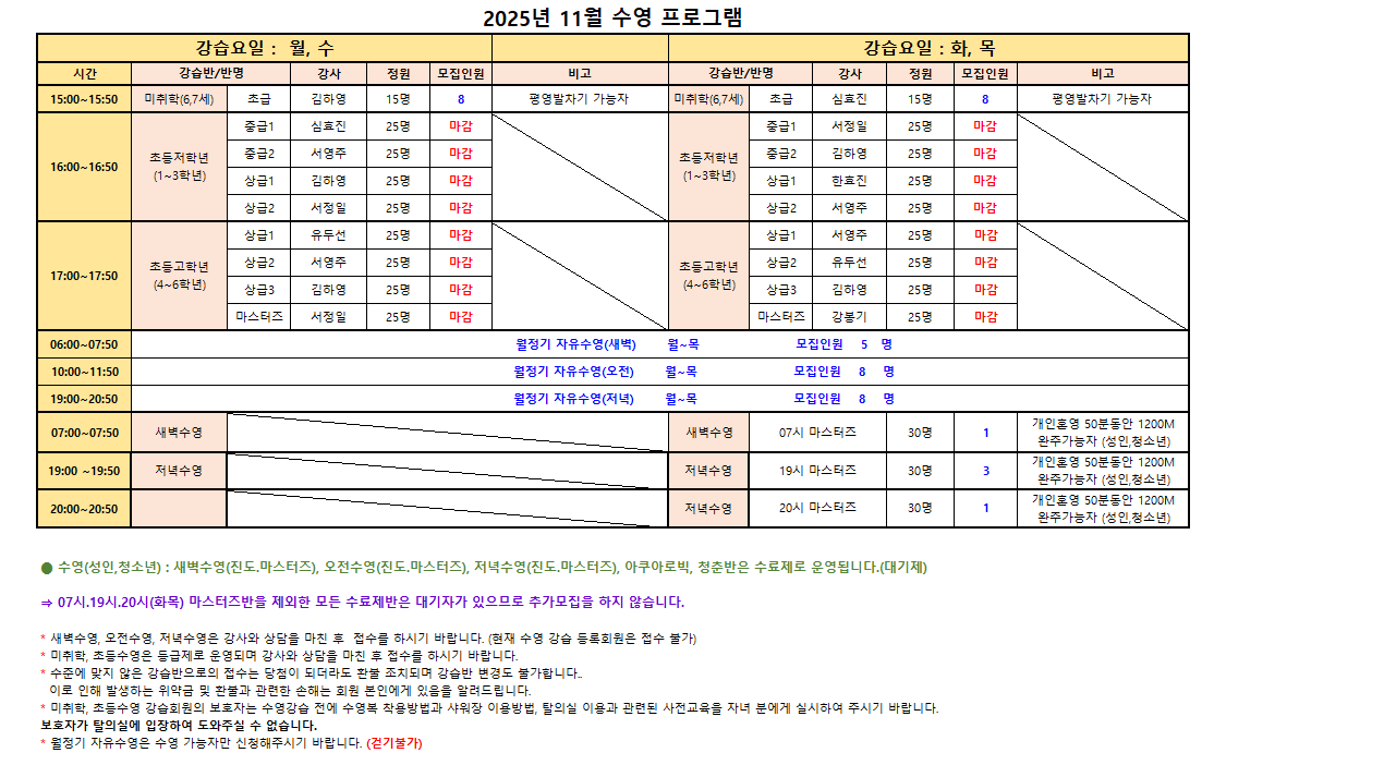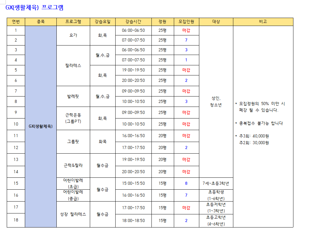 ⇒ 07시.19시.20시(화목) 마스터즈반을 제외한 모든 수료제반은 대기자 있으므로 추가모집을 하지 않습니다.