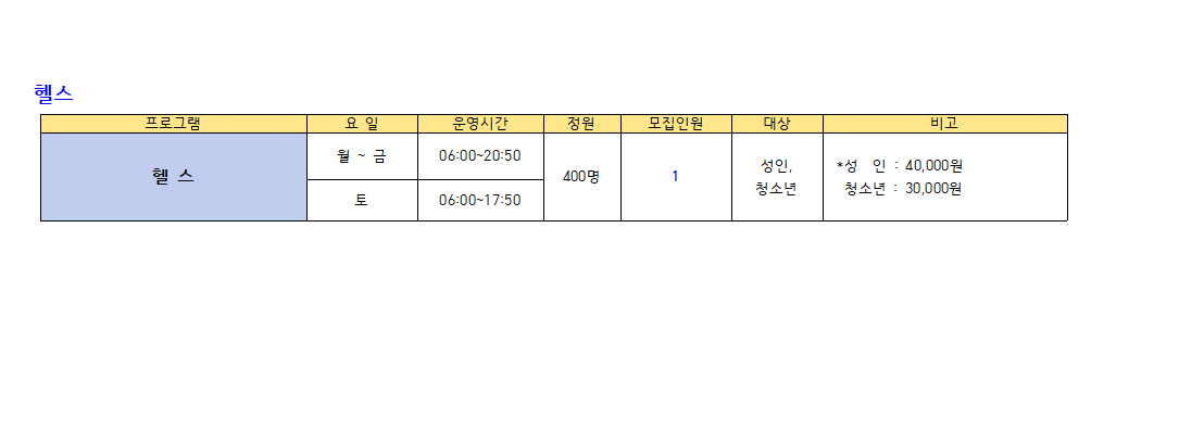 ※수영(성인,청소년) : 새벽수영(진도.마스터즈), 오전수영(진도.마스터즈), 저녁수영(진도.마스터즈), 아쿠아로빅, 청춘반은