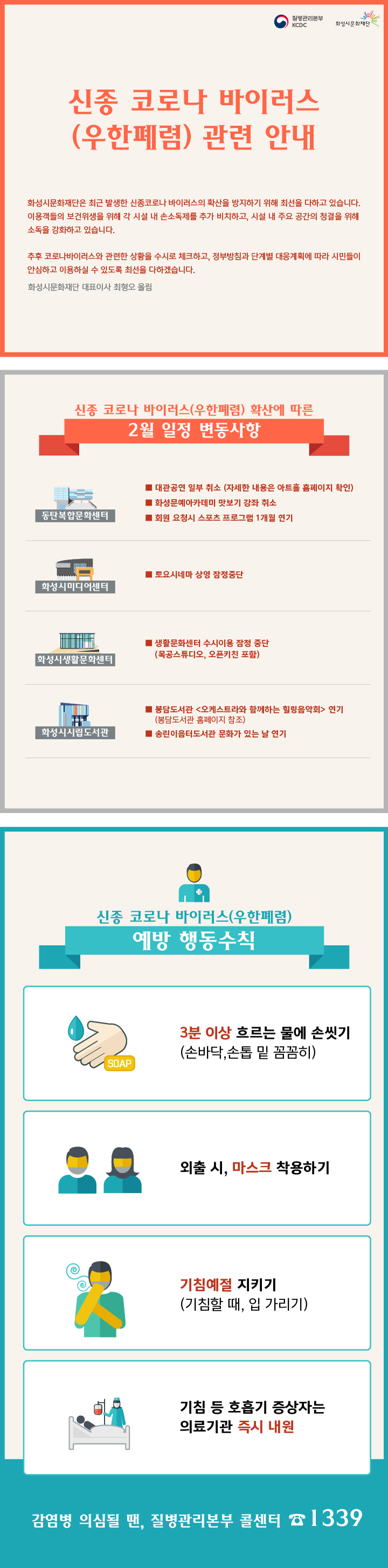 [공지] 신종 코로나 바이러스 확산에 따른 2월 일정 변동사항 안내 작성자 관리자 작성일 2020년 2월 3일 15시 36분 15초 조회 1,302 ..jpg [ Size : 620.48KB, Down : 1,284 ] 미리보기 다운로드 목록보기