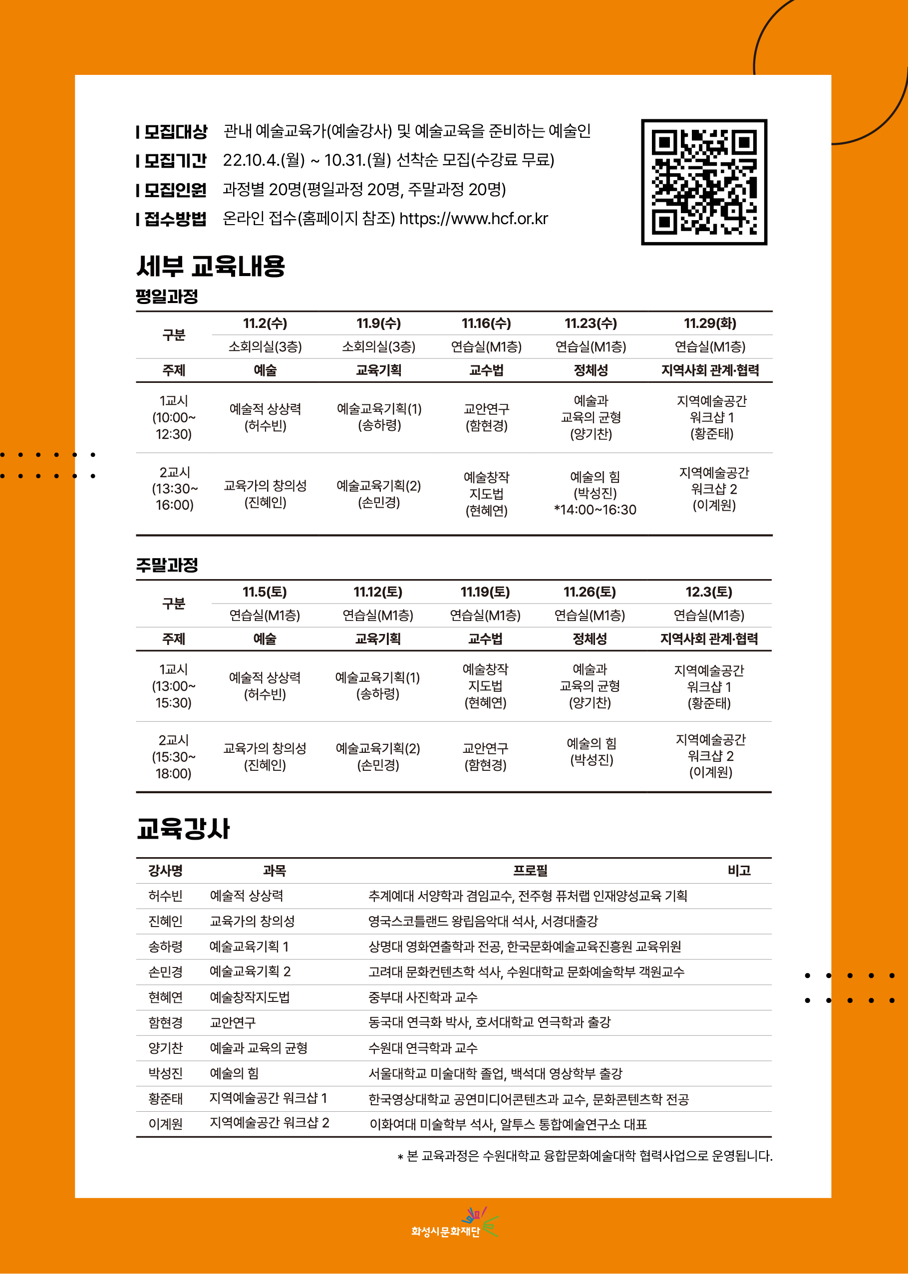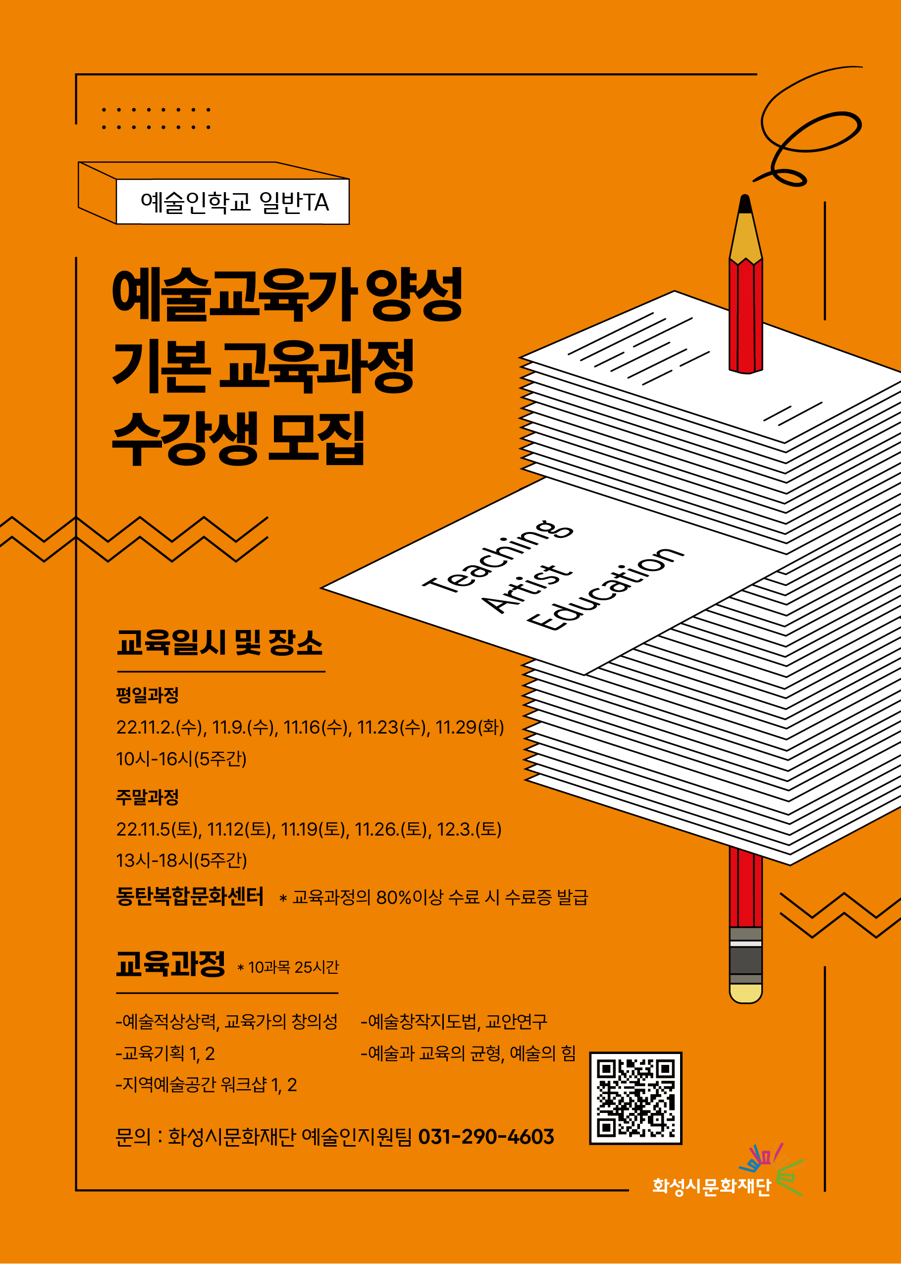 [예술인학교 일반TA] 예술교육가 양성 기본교육과정 수강생 모집 작성자 관리자 작성일 2022년 10월 5일 14시 36분 18초 조회 1,272 전단지(148x210)_앞.png [ Size : 224.61KB, Down : 221 ] 미리보기 다운로드 전단지(148x210)_앞 사본 -전단지(148x210)_뒤.png [ Size : 283.19KB, Down : 310 ] 미리보기 다운로드 사본 -전단지(148x210)_뒤 화성시문화재단에서는 화성시에서 활동하고 있는 예술교육가를 위해예술교육활동에 필요한 기본 교육과정을 마련했습니다.현재 활동하고 있는 예술교육가에게는 재교육의 기회를 제공하고, 신규 예술교육가에게는 교육 기본방향을 정립할 수 있는 기본 교육과정입니다.관심 있으신 예술교육가들의 많은 참여 부탁드립니다.- 모집이 마감되었습니다-고맙습니다문의 031-290-4603 목록보기
