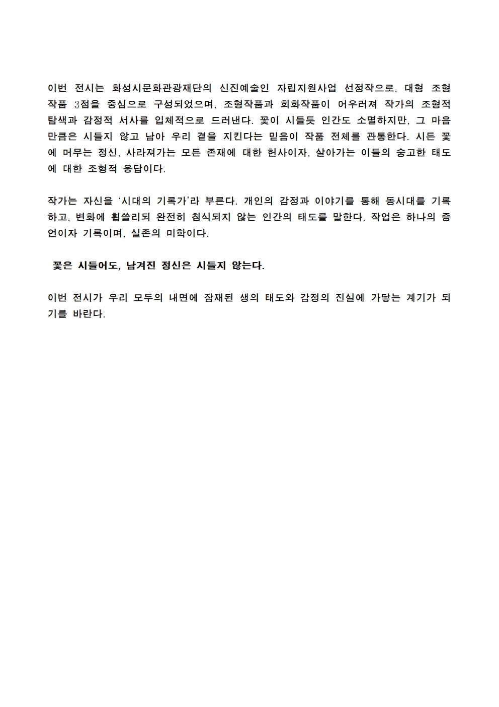 이번 전시는 화성시문화관광재단의 신진예술인 자립지원사업 선정작으로, 대형 조형 작품 3점을 중심으로 구성되었으며, 조형작품과 회화작품이 어우러져 작가의 조형적 탐색과 감정적 서사를 입체적으로 드러낸다. 꽃이 시들듯 인간도 소멸하지만, 그 마음만큼은 시들지 않고 남아 우리 곁을 지킨다는 믿음이 작품 전체를 관통한다. 시든 꽃에 머무는 정신, 사라져가는 모든 존재에 대한 헌사이자, 살아가는 이들의 숭고한 태도에 대한 조형적 응답이다.