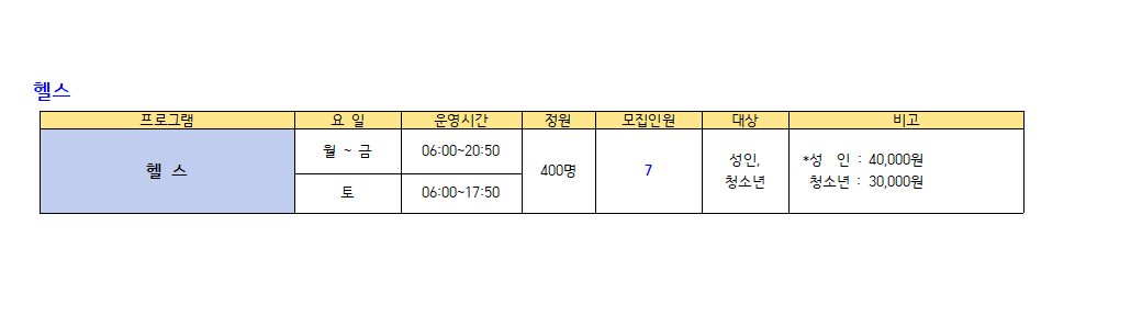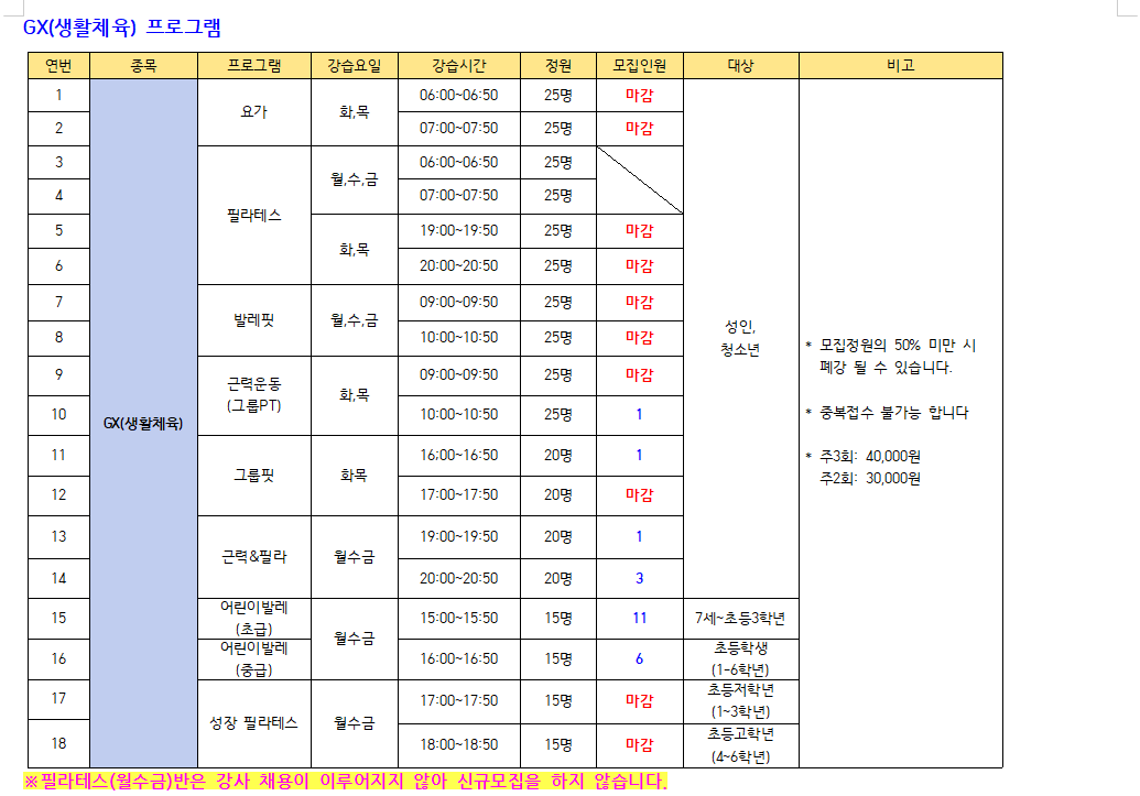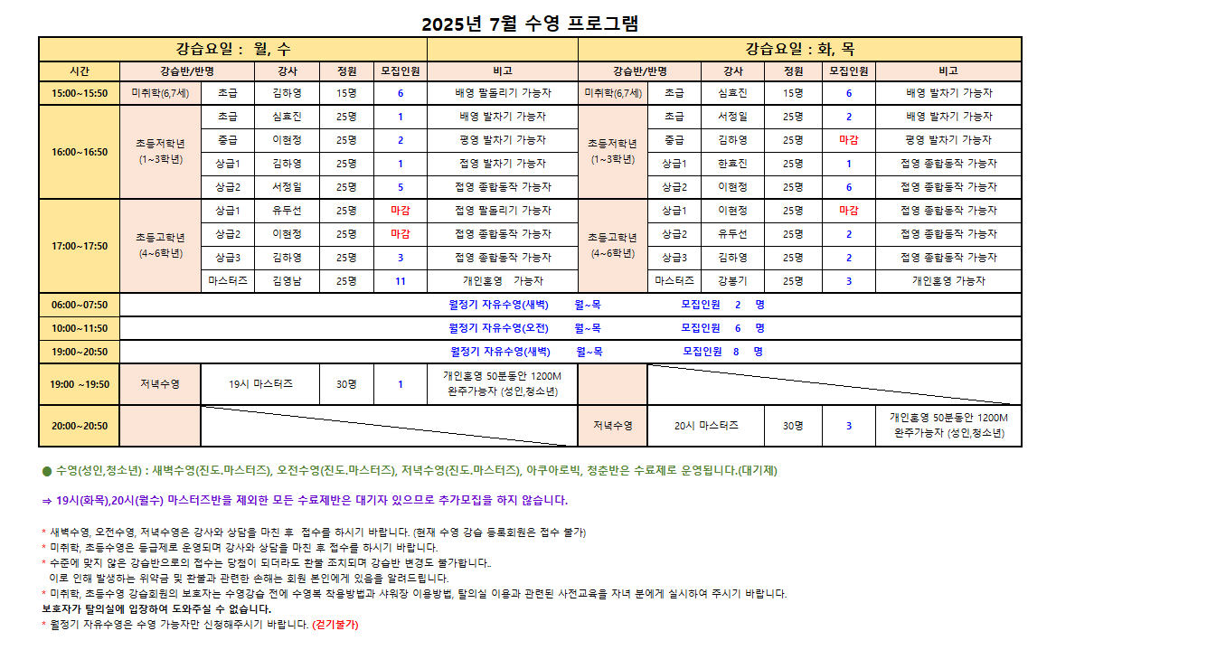※수영(성인,청소년) : 새벽수영(진도.마스터즈), 오전수영(진도.마스터즈), 저녁수영(진도.마스터즈), 아쿠아로빅, 청춘반은