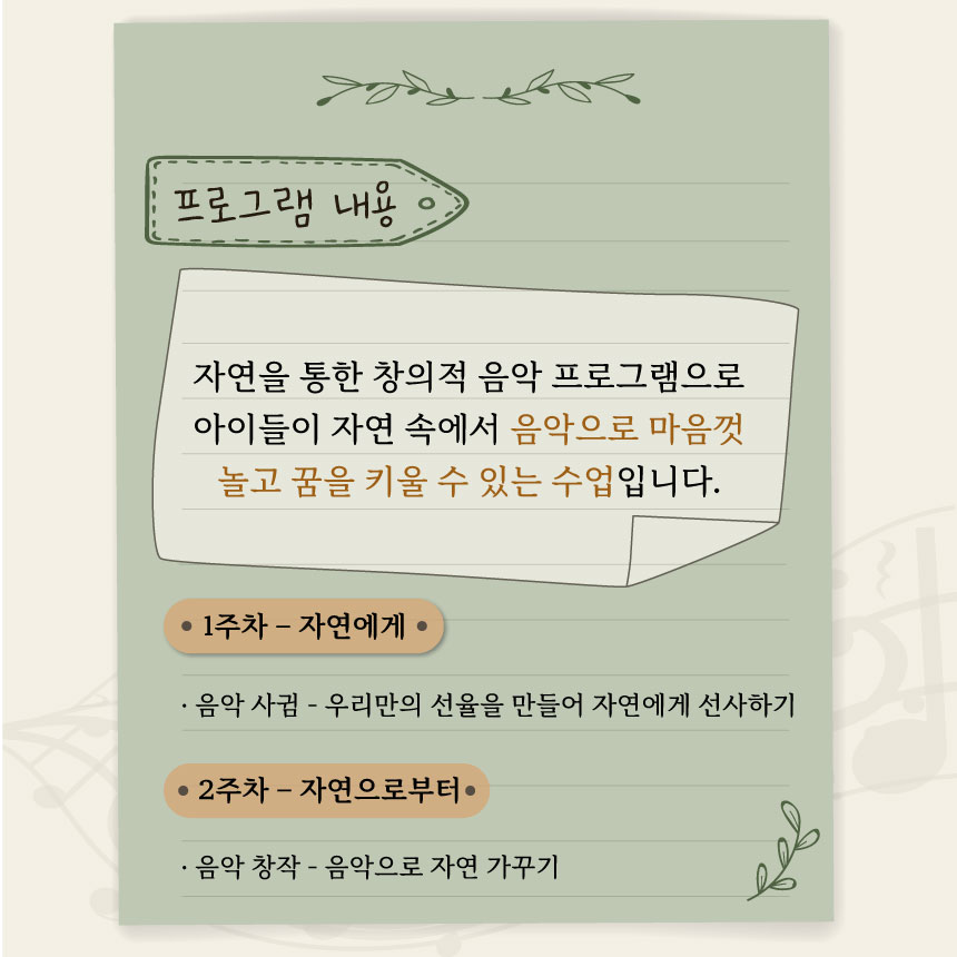 대 상 | 음악과 함께 자연에서 놀고 싶은 초등학생 친구들 10명 내외 |