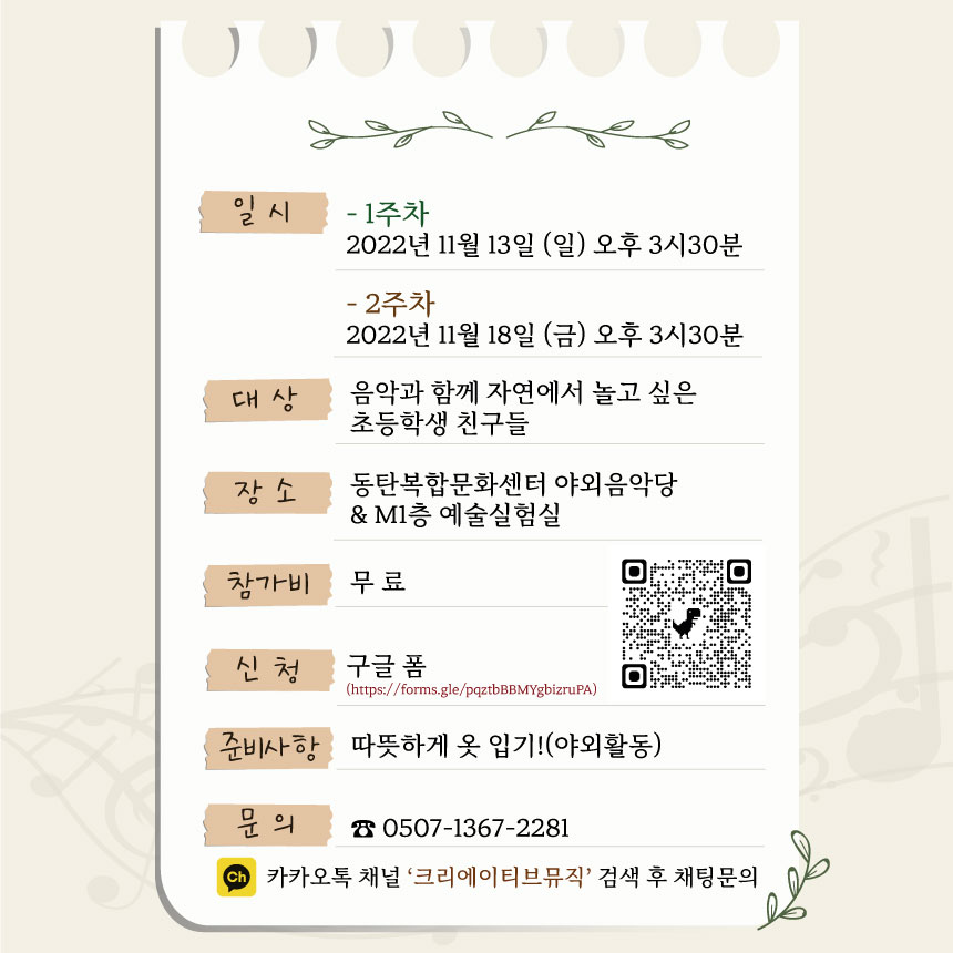 화성시문화재단과 크리에이티브 뮤직 팀이 함께 만든 자연을 통한 창의 음악 프로그램 ‘자연스러운 음악’ 참여자를 모집합니다.