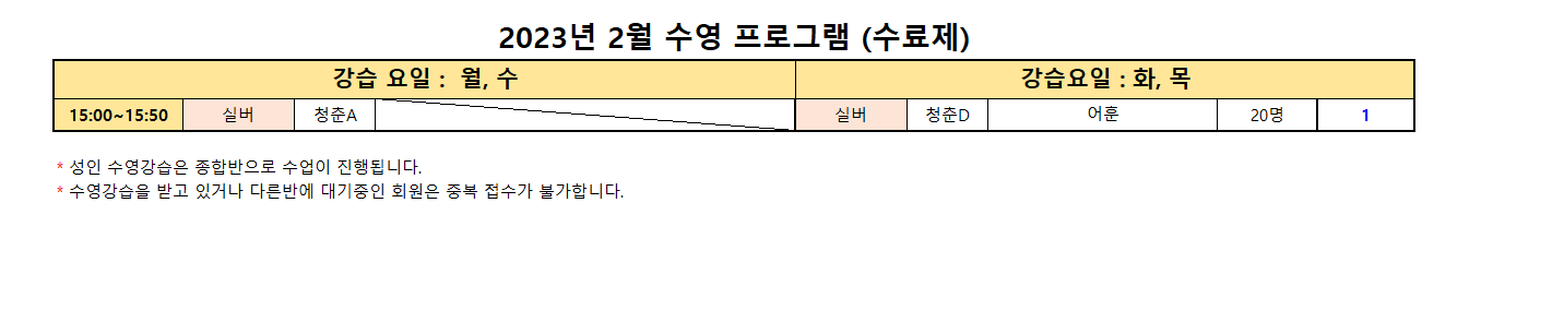 *성인 수영강습은 종합반으로 수업이 진행됩니다.