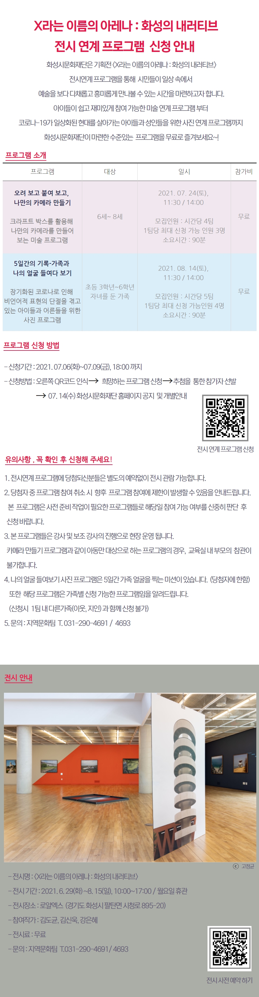 <X라는 이름의 아레나:화성의 내러티브> 전시연계 프로그램 신청 안내 작성자 관리자 작성일 2021년 7월 5일 16시 34분 23초 조회 675 연계 프로그램 상세페이지.jpg [ Size : 1.02MB, Down : 510 ] 미리보기 다운로드 전시연계 프로그램 상세페이지(PDF).pdf [ Size : 1.02MB, Down : 341 ] 다운로드 전시연계프로그램 신청 바로가기 ▶▶▶ http://naver.me/5jATwB8d전시연계프로그램 진행 장소 : 로얄엑스 (화성시 팔탄면 시청로 895-20) 목록보기
