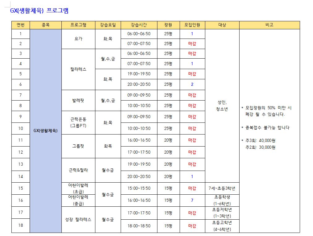⇒ 새벽07시, 저녁19시 마스터즈(화목)반을 제외한 모든 수료제반은 대기자가 있으므로 추가모집을 하지 않습니다.