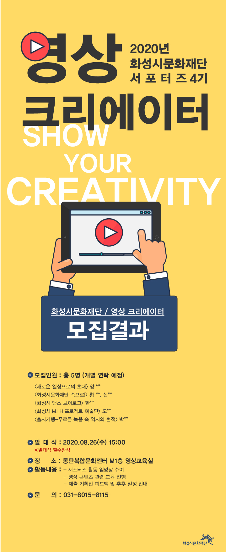 2020 화성시문화재단 영상 크리에이터 모집 결과 안내 작성자 관리자 작성일 2020년 8월 18일 17시 7분 29초 조회 528 2020영상서포터즈-모집결과-(웹배너용).jpg [ Size : 412.77KB, Down : 372 ] 미리보기 다운로드 2020 화성시문화재단 영상 크리에이터 모집 결과 안내○ 모집인원 : 총 5명 ○ 발대식 : 2020.08.26 (수) 오후 3시 ○ 장소 : 경기도 화성시 노작로 134 동탄복합문화센터 M1층 영상교육실○문의 : 031-8015-8115 목록보기